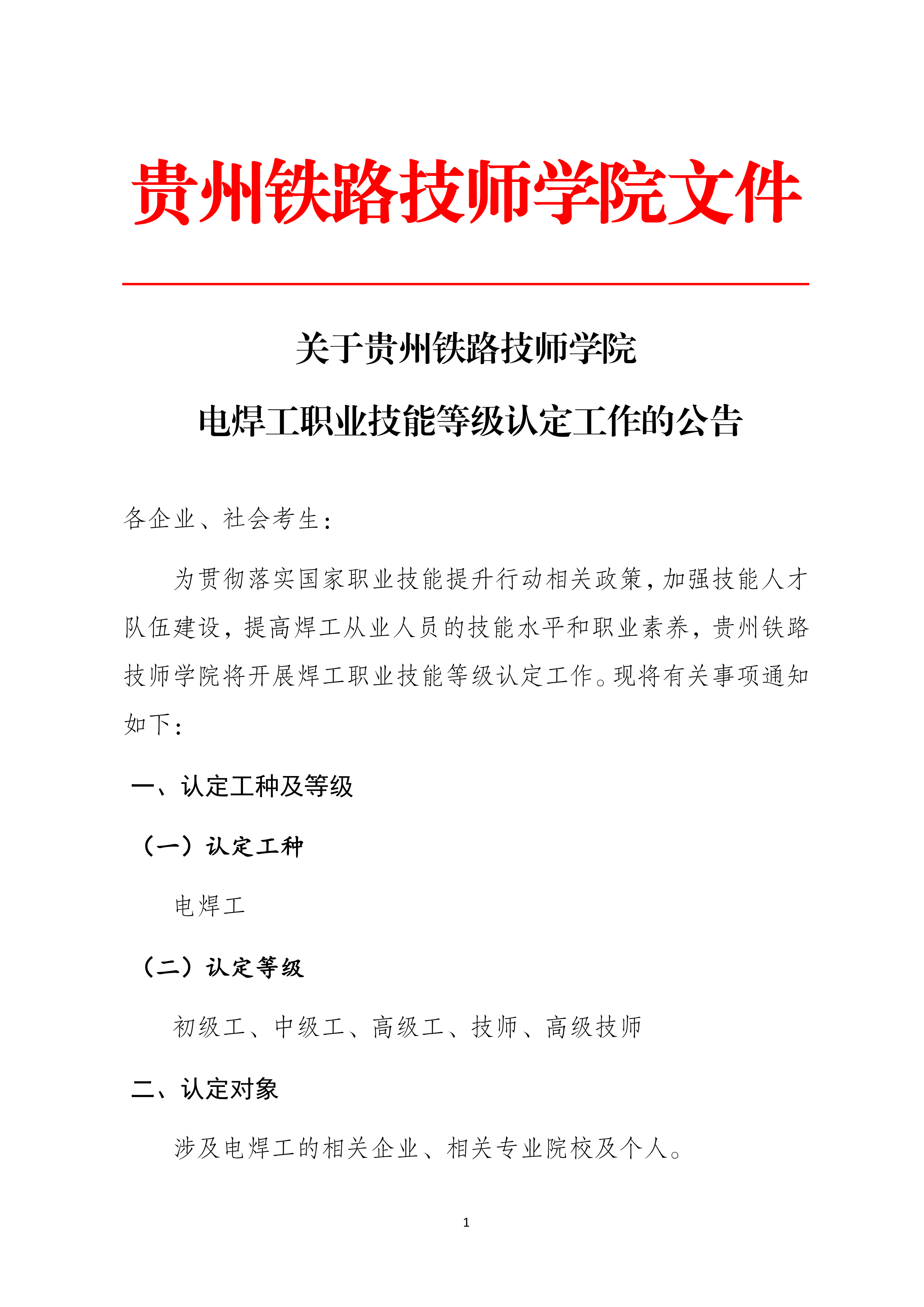 关于贵州铁路技师学院电焊工职业技能等级认定工作的公告